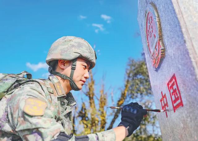 仲春时节,陆军某边防连巡逻分队官兵为界碑描红。